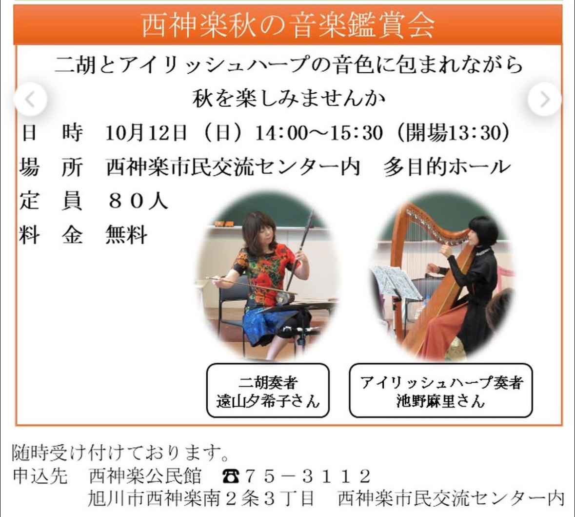 演奏後にアイリッシュハープと二胡の体験会がありますので、どうぞそちらもお楽しみに!